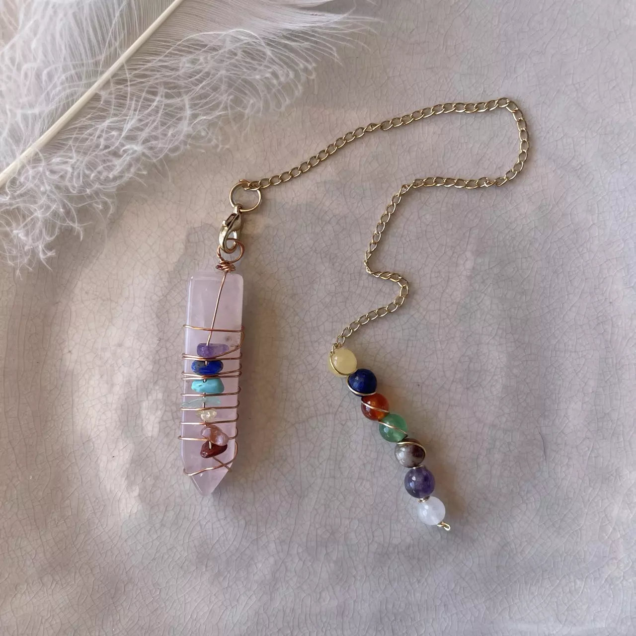 Pendel i rosenkvarts med en krystall for hvert chakra. Brukes som et intuisjonsverktøy eller til Reiki-healing. En pendel brukt til Reiki-healing er ofte laget av krystaller eller metall og henger fra en kjede. Den hjelper med å finne energiblokkeringer, balansere chakraer og fremme energiflyten. Pendelen reagerer på subtile energier, og bevegelsene dens kan gi innsikt i kroppens energitilstand.