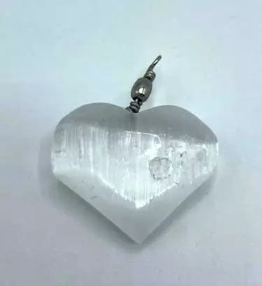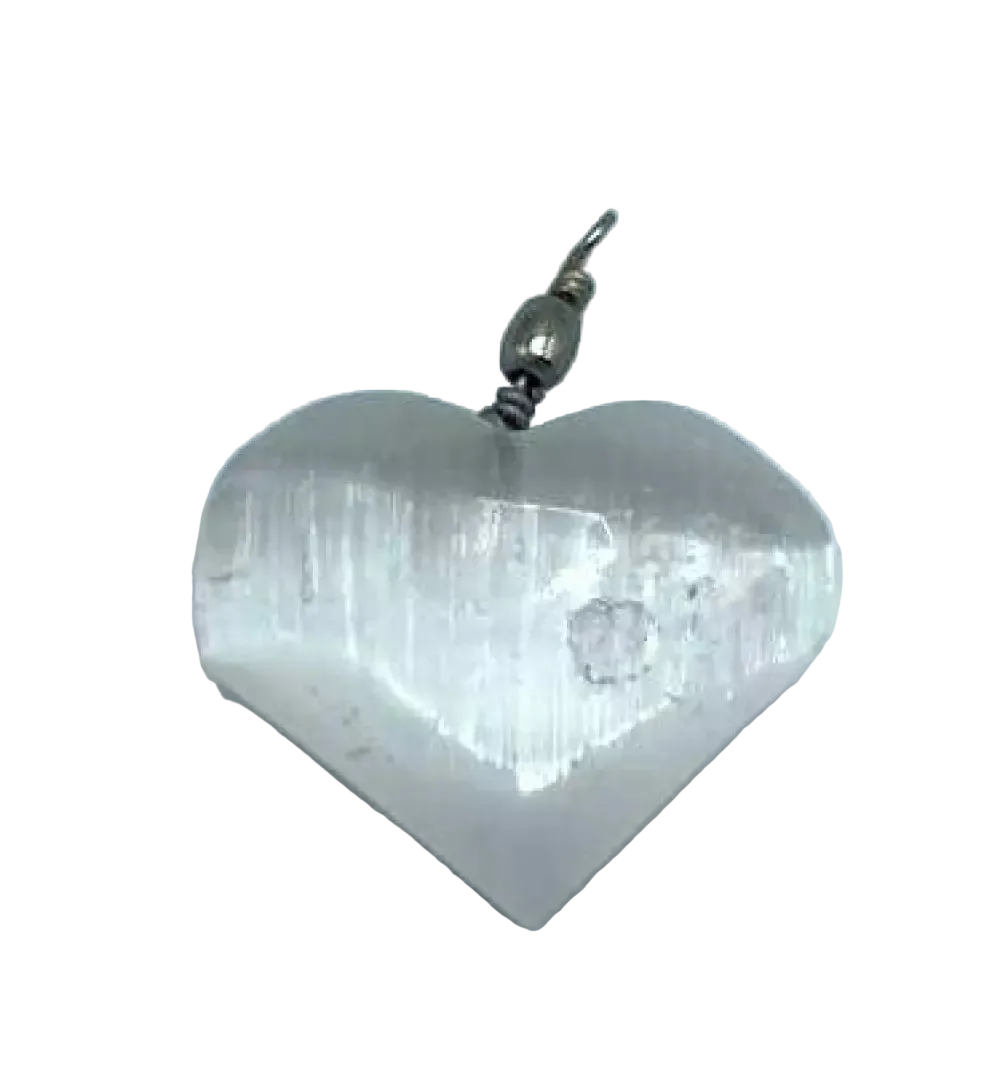 Anheng formet som hjerte i naturlig selenitt. Et mykt og lyst smykke som forbindes med indre ro, klarhet og energetisk renselse. Selenitt brukes ofte for å skape balanse og en følelse av fred.