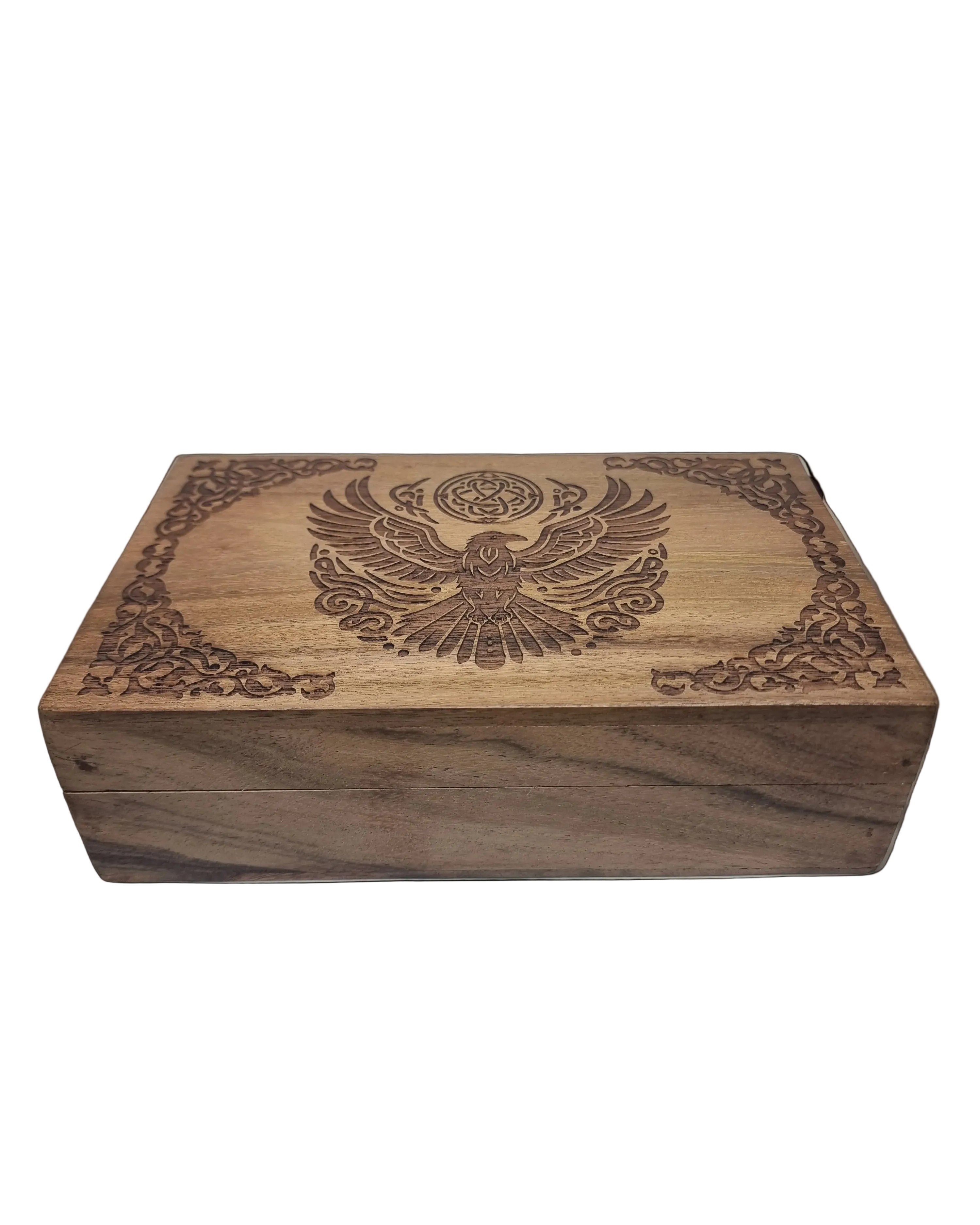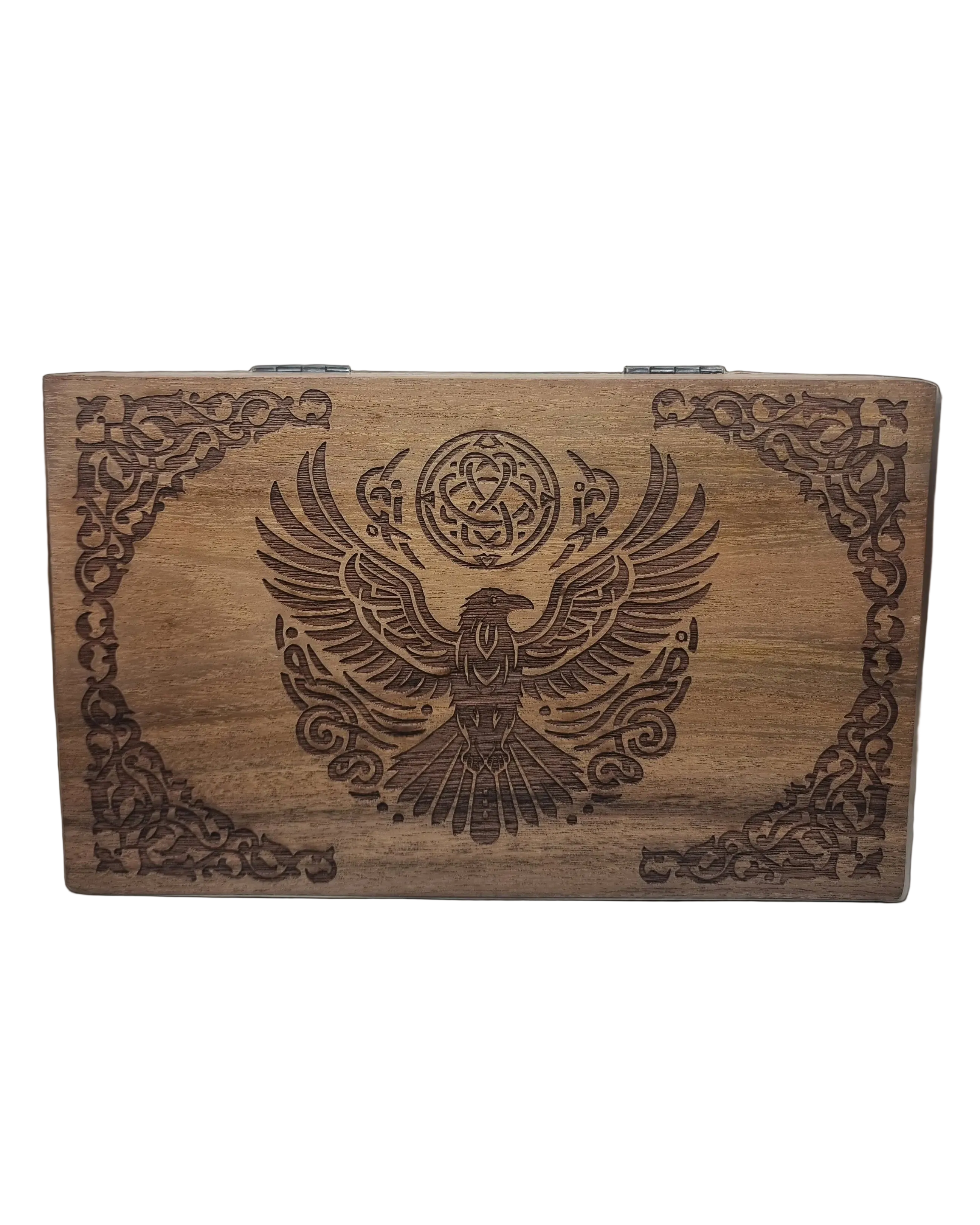Elegant treboks i akasie med nydelig utskjæring av en ravn, designet for oppbevaring av tarot- og orakelkort, krystaller eller spirituelle gjenstander. Hengslet lokk og håndverket utførelse gjør den til et vakkert tilskudd på ethvert alter eller hylle.